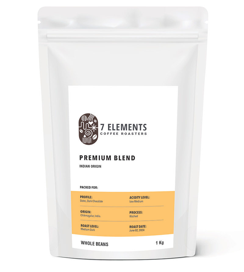 Premium Blend INDIAN ORIGIN ₹ 280 – 660 M.R.P ₹ 350 – 825 See pricing details below (Inclusive of all Taxes) Whole Beans and Ground Coffee Roast Level: Medium Dark Ingredients: Arabica and Robusta Profile: Dates, Dark Chocolate Acidity Level: Low-Medium Process: Washed Origin: Chikmagalur Brewing Details Enjoyed Black and with Milk Available Quantity 100g – ₹280 250g – ₹660 " style="caret-color: #000000; color: #000000; font-style: normal; font-variant-caps: normal; font-weight: 400; letter-spac