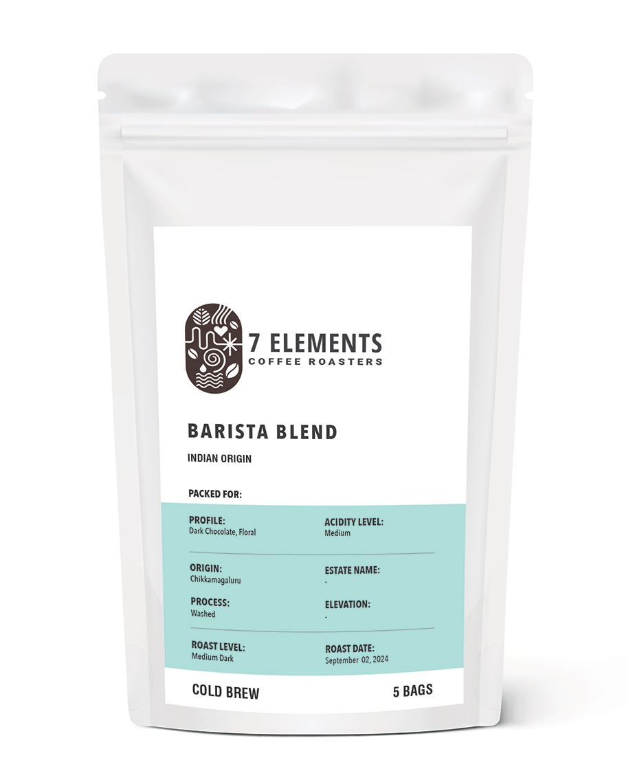 Barista Blend – Medium Dark INDIAN ORIGIN ₹ 450 Inclusive of all taxes 225 g (5 Bags x 45 g) Each Bag makes 450 ml coffee Roast Level: Medium Dark Ingredients: Arabica and Robusta Blend Profile: Dark Chocolate, Floral Acidity Level: Medium Process: Washed Origin: Chikmagalur Brewing Details Enjoyed Black and with Milk Available Quantity
