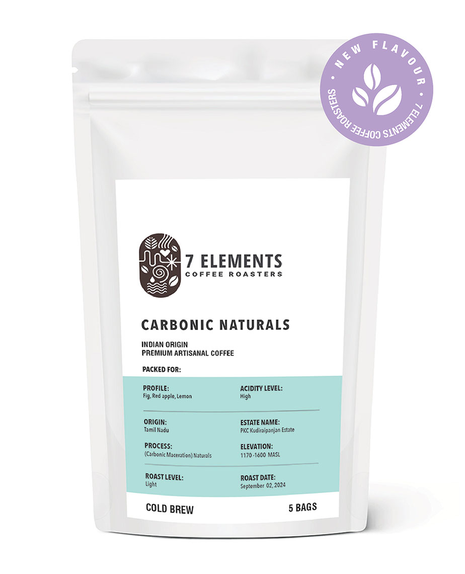 Carbonic Naturals INDIAN ORIGIN PREMIUM ARTISANAL COFFEE ₹ 880 M.R.P ₹ 1100 Inclusive of all taxes 225 g (5 Bags x 45 g) Each Bag makes 450 ml coffee Roast Level: Light Ingredients: 100% Arabica Profile: Fig, Red apple, Lemon Acidity Level: High Process: (Carbonic Maceration) Naturals Origin: Tamil Nadu Brewing Details Enjoyed Black and with Milk Available Quantity