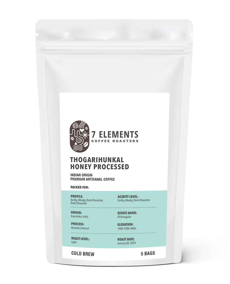 Thogarihunkal Honey Processed INDIAN ORIGIN PREMIUM ARTISANAL COFFEE ₹ 340 225 g (5 Bags x 45 g) Each Bag makes 450 ml coffee Roast Level: Light roast Ingredients: 100% Arabica Profile: Citrus, Fig Acidity Level: Medium High Process: (Honey) Sun Dried Origin : Chikamangalur, Thogarihunkal Estate Brewing Details Enjoyed without Milk – Only Black Coffee Available Quantity