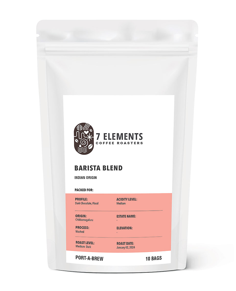 Barista Blend – Medium Dark INDIAN ORIGIN ₹ 340 Inclusive of all taxes 120 g (10 Bags x 12 g) Roast Level: Medium Dark Ingredients: Arabica and Robusta Profile: Dark Chocolate, Floral Acidity Level: Medium Process: Washed Origin: Chikkamaguluru Brewing Details Enjoyed Black and with Milk Available Quantity