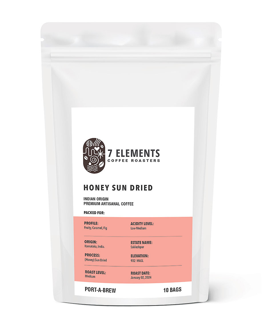 Honey Sun Dried INDIAN ORIGIN PREMIUM ARTISANAL COFFEE ₹ 470 M.R.P ₹ 590 Inclusive of all taxes 120 g (10 Bags x 12 g) Roast Level: Medium Ingredients: 100% Arabica Profile: Fruity, Caramel, Fig Acidity Level: Low-Medium Process: (Honey) Sun Dried Origin: Karnataka, Sakleshpur Brewing Details Enjoyed Black and with Milk Available Quantity