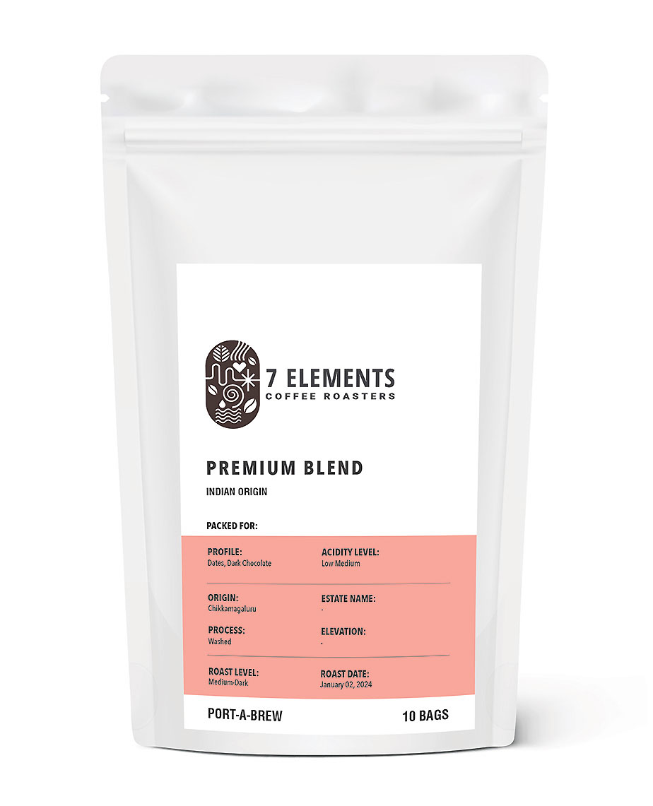 Premium Blend INDIAN ORIGIN ₹ 540 M.R.P ₹ 675 Inclusive of all taxes 120 g (10 Bags x 12 g) Roast Level: Medium Dark Ingredients: Arabica and Robusta Profile: Dates, Dark Chocolate Acidity Level: Low-Medium Process: Washed Origin: Chikkamaguluru Brewing Details Enjoyed Black and with Milk Available Quantity