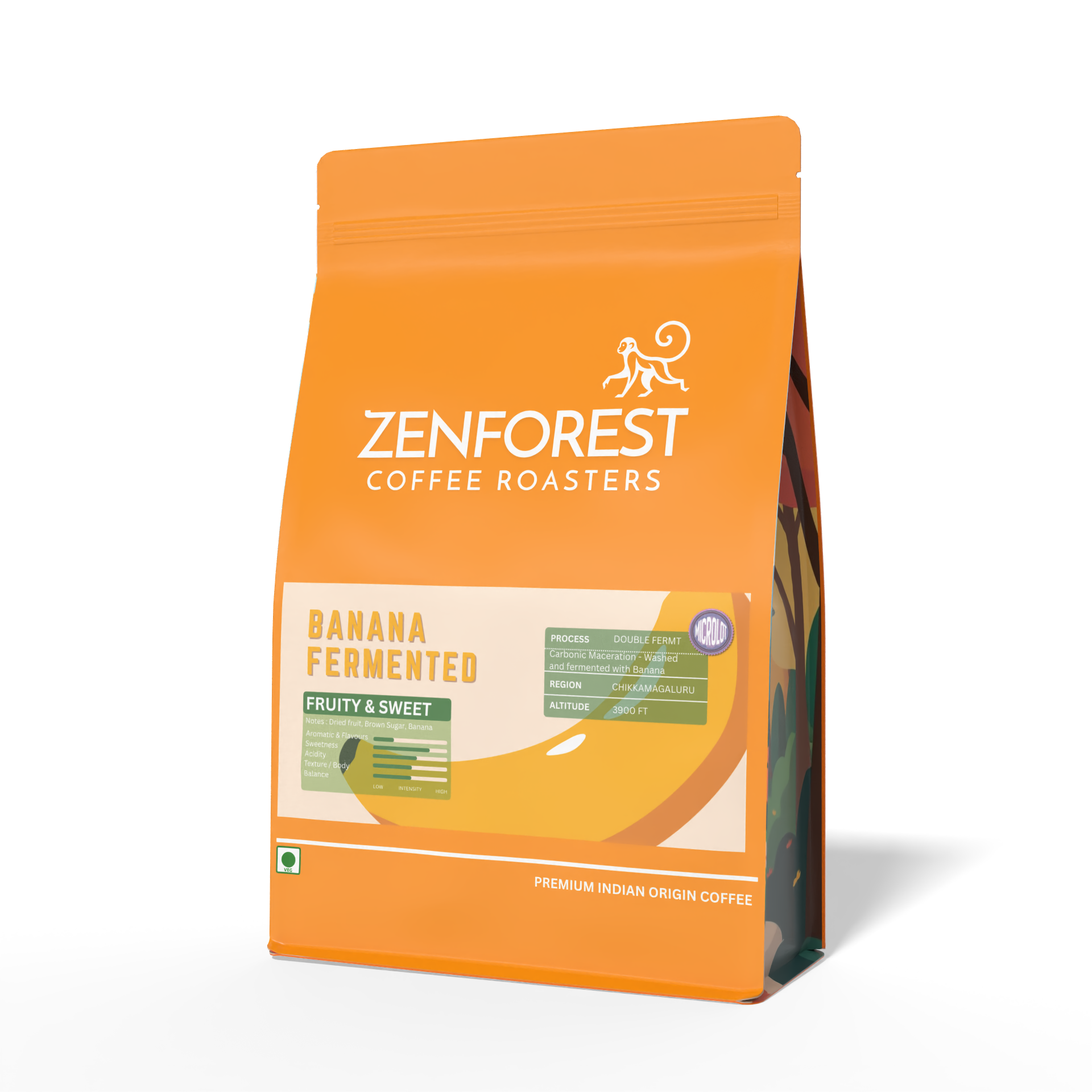 Banana Fermented FRUITY & SWEET Medium ● ● ● ● ● ● ● Notes / Banana · Toffee · Cocoa · Spice Aromatics & Flavour Sweetness Acidity Body Balance Process Double Ferment Carbonic maceration with banana fermentation Region Chikmagaluru Altitude 3900 FT Zenforest Coffee — Premium Indian Origin