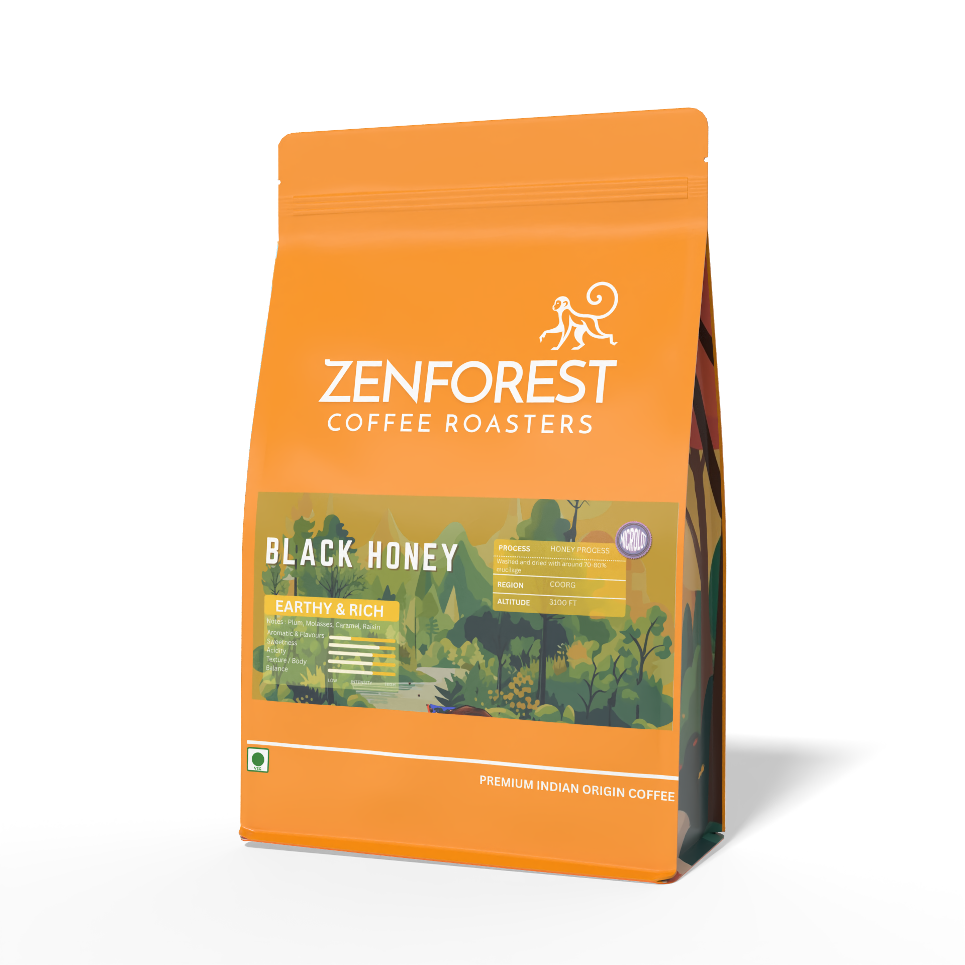 Black Honey Earthy & Rich Medium ● ● ● ● ● ● ● Notes / Plum, Molasses, Caramel, Raisin Aromatics & Flavour Sweetness Acidity Body Balance Process Honey Process Washed and dried with around 70-80% mucilage Region Coorg Altitude 3100 FT Zenforest Coffee — Premium Indian Origin