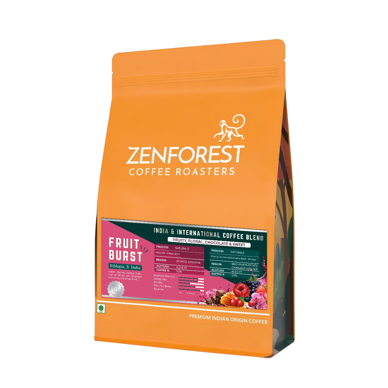 Berries · Tropical Fruits · Florals · Chocolate · Honey Finish Aromatics Sweetness Body Sidamo, Ethiopia — 50% NATURALS · 6,234 FT Shade Dried Berry-forward sweetness and wild, juicy intensity from one of Ethiopia’s most celebrated coffee regions. Mathavara Estate — 50% CHERRY FERMENTED · 4,000 FT 18 Days Dried Chikkamangalore single-estate depth — chocolatey body and clean sweetness that anchors the blend. Zenforest Coffee — India × Ethio